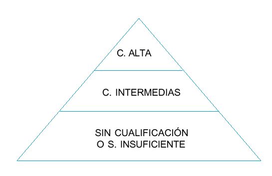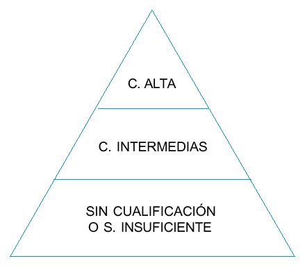 La pirámide cualificativa de la formación de los países con un sistema educativo en el que se ha generalizado hace pocos años la escolarización básica suele tener una amplia base de personas sin cualificación, con una franja de cualificaciones intermedia muy modesta y una cúspide de técnicos superiores escasa. Tal es el caso, por ejemplo, de España y Portugal.