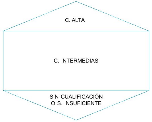 En cambio en aquellos países en los que se lleva mucho tiempo invirtiendo en educación y formación la representación de las cualificaciones suele tener forma hexagonal, es decir, con una escasa franja de población sin cualificación, un amplísimo sector con cualificaciones medias y una tasa moderada de cualificaciones superiores.