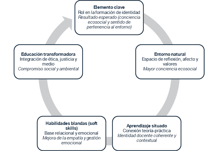 En estos tiempos, en medio de una crisis ecosocial importante, es fundamental interiorizar el medio natural en el proceso de construcción de la identidad del docente, toda vez que este no es el mero escenario de la práctica docente, sino que también es un agente de formación de valores, actitudes y habilidades fundamentales, tal como explica Villacís Tagle (2024). En la construcción de la identidad humana, la relación con el medio natural promueve procesos de reflexión, crítica y/o compromiso moral y cívico, (Goleman, 2006; Camarero, 2025) y la exposición al medio entorno, que promueve además la relación emocional que incide en cómo los estudiantes a formarse entienden su rol como agentes de cambio social, democrático y ambiental (García-Peinado, 2025).