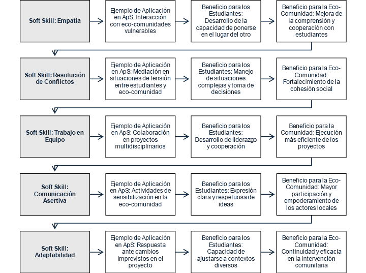 Sin embargo, sigue siendo un desafío incorporar estas capacitaciones en el currículo, ya que, sin marcos y metodologías claras y definidas para medirlas, es difícil aplicarlas de manera efectiva y sostenible en la práctica (Guerra-Macías y Tobón, 2025). Por lo tanto, este trabajo busca una manera de explorar cómo el desarrollo de Competencias-APS junto con el soft skills en las Prácticas y reciclaje profesional puede fortalecer una formación docente sensible, ética, ecosocialmente comprometida e interculturalmente responsable, orientada a la ciudadanía democrática y a la defensa de los derechos humanos.