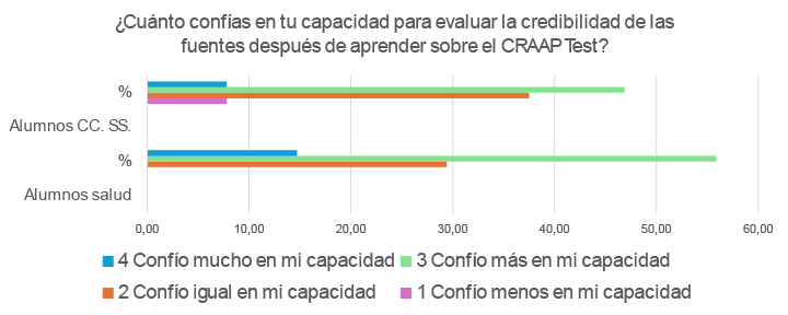 En la primera pregunta un 47% declaraba confiar más en su capacidad para averiguar la credibilidad de las fuentes, frente a un 37% que confiaba igual en su capacidad, un 7,8% que confiaba menos y este mismo porcentaje se aplica a los que confiaban mucho en su capacidad. Apenas la mitad de la muestra consideraba que el Test CRAAP les haya sido de utilidad a la hora de evaluar la veracidad de las noticias. Tras la revisión final de cada uno de los textos propuestos, se comprobó que en muchas ocasiones (un 60%) no habían identificado correctamente las noticias y los bulos y, por tanto, el test no les había sido de ayuda.