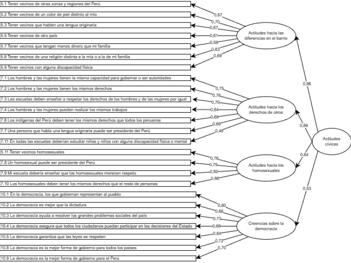 Actitudes cívicas. Para obtener un factor general de actitudes cívicas, se consideraron las escalas de Actitudes hacia las diferencias en el barrio, Actitudes hacia los derechos de los otros y Creencias sobre la democracia. Todas estas escalas tuvieron formatos de respuesta tipo Likert con cuatro opciones de respuesta desde “Totalmente en desacuerdo” a “Totalmente de acuerdo”.