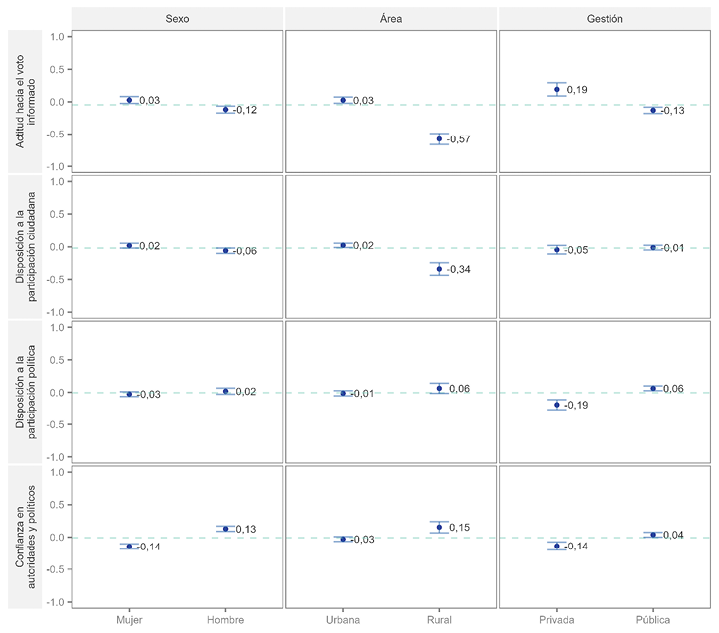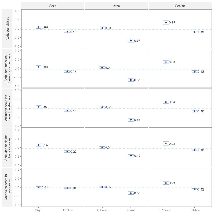 Como se puede observar en la Figura 2, en el factor general, así como las subescalas, las mujeres tuvieron un mayor puntaje que los hombres, excepto en las creencias sobre la democracia. De igual forma, en actitudes cívicas y las subescalas los estudiantes de escuelas urbanas y de gestión privada obtuvieron un mayor puntaje. Como referencia, la media nacional es la línea punteada.
