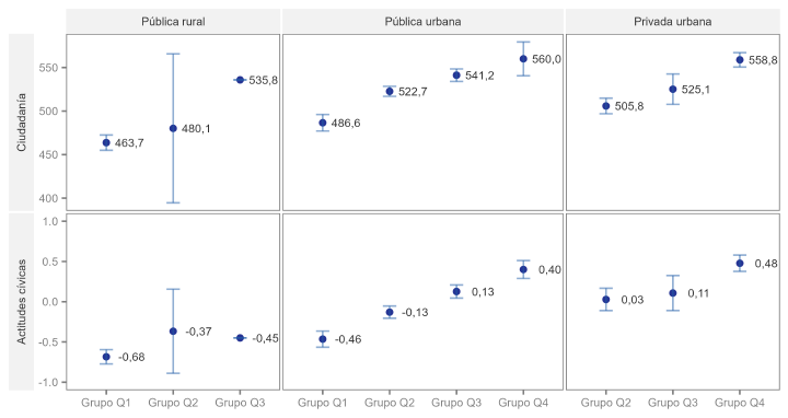Para profundizar en los factores asociados al rendimiento en Ciudadanía y a las actitudes cívicas, a continuación, se presentan los resultados descriptivos de las escalas reportadas por los estudiantes incluidas en los modelos de regresión por estratos.