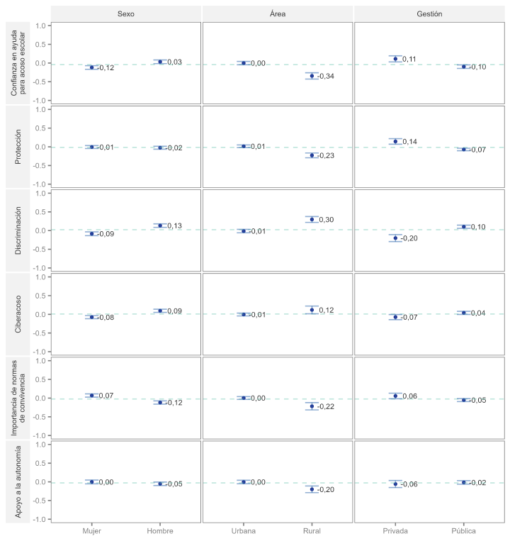 En la Figura 4, se pueden encontrar, en primer lugar, las medias de las escalas de convivencia escolar por sexo, gestión, y área con la media nacional en la línea punteada como referencia. Se encontró que las mujeres perciben una mayor confianza para la ayuda frente al acoso escolar, aunque también reportan presenciar con mayor frecuencia discriminación y ciberacoso en el contexto escolar. Los hombres, por otro lado, perciben que sus escuelas se le da una mayor importancia a las normas de convivencia en comparación con las mujeres. En cuanto a las diferencias por gestión y área, se encuentra una mayor confianza en ayuda para el acoso escolar y protección tanto en escuelas privadas como urbanas, así como un menor nivel de discriminación en ambas. En ciberacoso, si bien hay un puntaje ligeramente mayor en escuelas públicas o rurales, no se encuentran diferencias estadísticamente significativas. En cuanto a la importancia de normas de convivencia y apoyo a la autonomía, estas fueron ligeramente más altas en escuelas urbanas, aunque no hubo diferencias estadísticamente significativas por gestión.